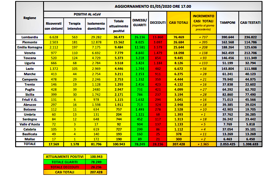 Tendenzialmente stabile l’epidemia di Coronavirus in Italia, nel primo giorno della nuova ‘fase’ dell’emergenza per quanto riguarda il bollettino della Protezione Civile. I dati di oggi, 1 maggio, parlano di 207.428 i casi totali di coronavirus finora registrati in Italia, comprendenti il numero di persone attualmente positive (100.943, in decremento di 608 rispetto a ieri), quelle guarite (78.249, in aumento di 2.304 su ieri) e quelle purtroppo decedute (siamo a quota 28.236, con un incremento di 269 su ieri, incremento che è comunque il secondo più basso dai primi di marzo ad oggi).