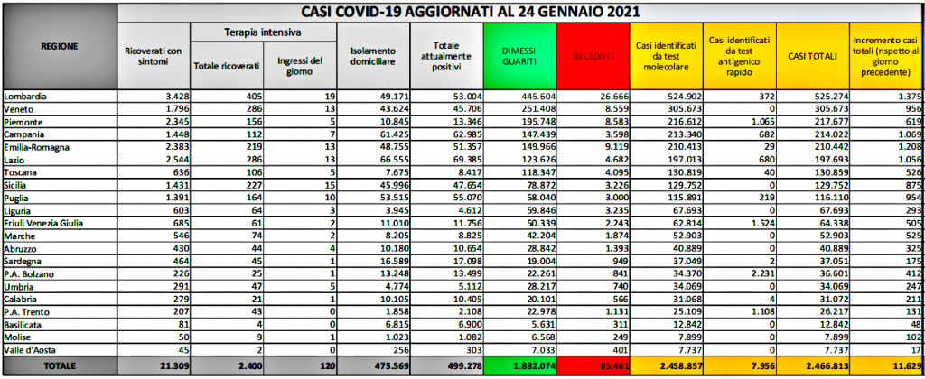 Nelle ultime 24 ore sono stati registrati 216.211 tamponi a fronte di 11.629 nuovi casi d’infezione da Sars-Cov-2, con un tasso di positività che risale quindi al 5,38% (+0,72%). Ieri erano stati registrati 286.331 tamponi totali a fronte di 13.331 nuovi casi d’infezione da Sars-Cov-2, con un tasso di positività del 4,66%. I dimessi-guariti a 1.882.074 da inizio pandemia, +10.885 nelle ultime 24 ore. Le persone attualmente positive al Covid-19 in Italia sono 499.278, e tornano a salire: sono 444 in più rispetto a ieri. Le persone attualmente positive al Covid-19 in Italia sono 499.278, di queste 21.309 sono ricoverate in ospedale con sintomi, 2.400 sono ricoverate in terapia intensiva, con 120 nuovi ingressi nelle ultime 24 ore. In isolamento domiciliare con il Covid-19 ci sono 475.569 persone. Rispetto a ieri quindi diminuiscono i ricoveri in ospedale in area medica -94 e tornano ad aumentare le terapie intensive +14.