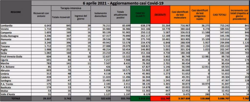 Sono 7.767 i nuovi casi di Sars Cov 2 registrati nelle ultime 24 ore in Italia e 421 i decessi (ieri 297). E’ quanto emerge dall’odierno bollettino del ministero della Salute-Iss. I tamponi effettuati sono stati 156.691 con un indice di positività dell’8,2% (ieri era stato del 7,2%). Rispetto a ieri le terapie intensive occupate in Italia da pazienti con coronavirus passano da 3.679 A 3.721: +42. Ieri le terapie intensive erano aumentate di 44 unità. La regione con più casi giornalieri è l’Emilia Romagna (+2.011), seguita da Lombardia (+1.793), Piemonte (+1.504), Lazio (+1.403), Campania (+1.169) e Toscana (+1.021). I contagi totali da febbraio 2020 salgono a 3.544.957. I guariti sono 19.725 (ieri 17.950), per un totale di 2.870.614. Torna a calare, quindi, il numero delle persone attualmente positive: sono 7.242 in meno (ieri +1.357), 565.993 in tutto. Di questi, sono in isolamento domiciliare 533.109 pazienti.