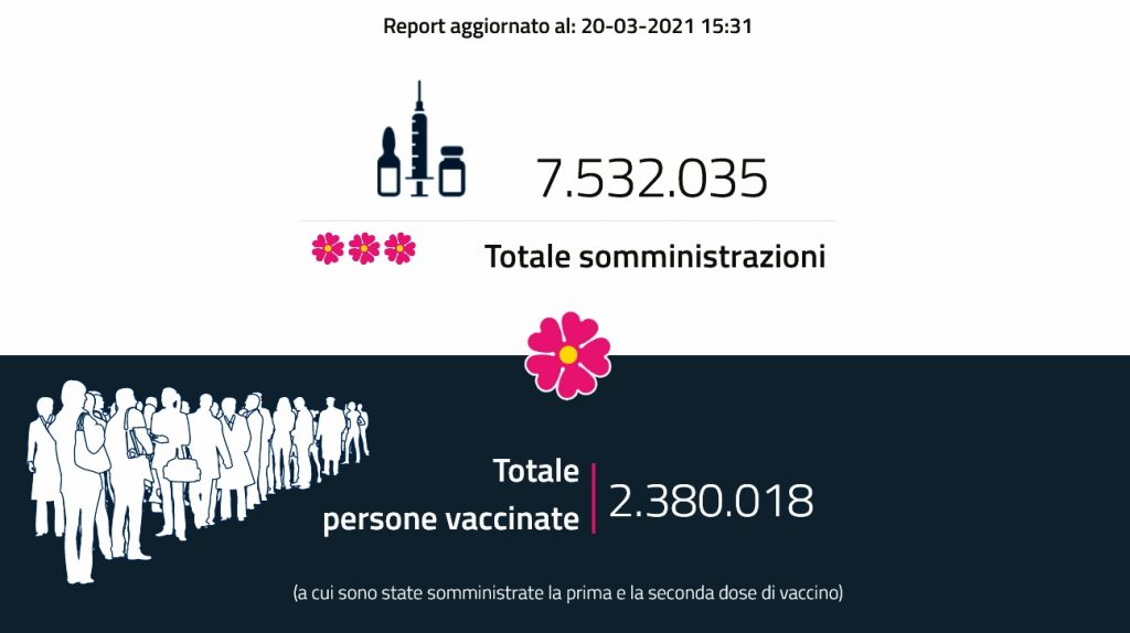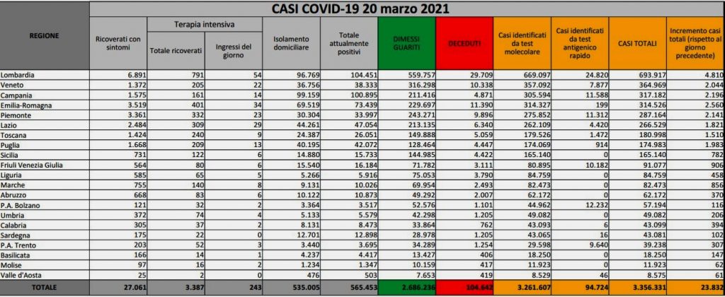Sono 23.832 i nuovi casi di coronavirus registrati in Italia nelle ultime 24 ore con 354.480 tamponi molecolari e antigenici effettuati e 401 i morti. E’ quanto emerge dall’odierno bollettino del ministero della Salute-Iss. Ieri venerdì 19 marzo 2021 si sono registrati 25.735 nuovi casi su 205.552 tamponi (12% positivi) e 159.270 test rapidi (0.65% positivi). Sono stati 386 i decessi mentre i pazienti ricoverati in area critica salgono a 3.364 al netto di 244 nuovi ingressi. Il tasso di positività per la pandemia da coronavirus oggi è del 6,7 per cento.