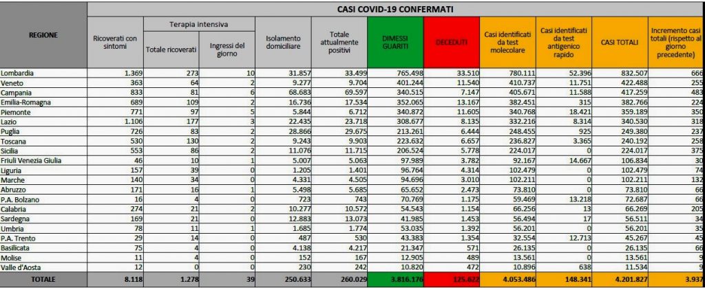 Sempre in netto calo i ricoveri: le terapie intensive sono 45 in meno (ieri -59) con 39 ingressi del giorno, il dato più basso da quando viene comunicato in bollettino (ossia dallo scorso dicembre), e sono ora 1.278. Giù anche i ricoveri ordinari, che calano di 439 unita’ (ieri -393), e scendono a 8.118. La regione con più casi odierni è la Lombardia (+666), seguita da Campania (+483), Sicilia (+375), Piemonte (+350) e Lazio (+318). Il totale dei contagi sale a 4.201.827. Ottimismo arriva anche dal ministro della Salute. Possiamo affrontare il futuro di questa pandemia “con maggiore fiducia soprattutto grazie alla presenza dei vaccini e grazie a un quadro epidemiologico più incoraggiante rispetto alle settimane precedenti” ha detto Roberto Speranza.