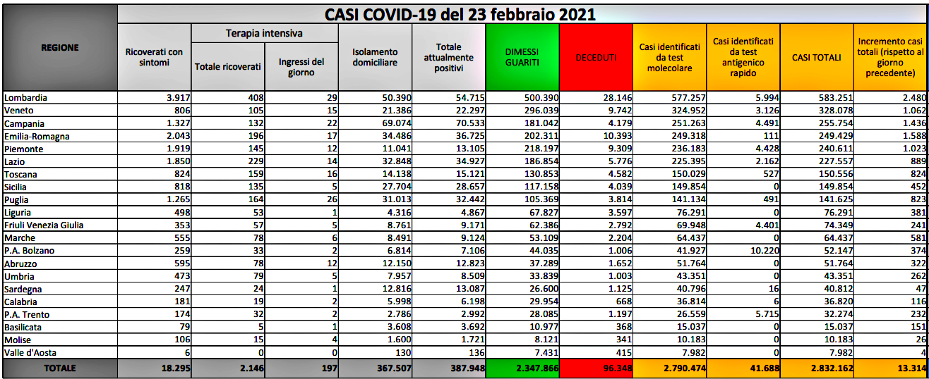Nelle ultime 24 ore in Lombardia si sono registrati 2.480 casi di coronavirus, di cui 89 ‘debolmente positivi’, e 43 morti. I decessi dall’inizio dell’epidemia salgono a 28.146. i tamponi effettuati sono stati 35.149 (di cui 22.540 molecolari e 12.609 antigenici) e il tasso di positività è al 7%. I guariti/dimessi sono 1.091 (totale complessivo: 500.390, di cui 3.548 dimessi e 496.842 guariti). I pazienti covid in terapia intensiva salgono a 408 (+17), mentre i ricoverati a 3.917 (+91). Ieri, a fronte di 17.871 tamponi, c’erano stati 1.491 positivi e 45 morti, con un tasso di positività all’8,3%.