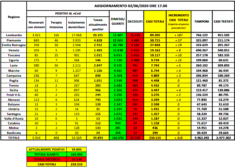 In Italia il coronavirus sembra indietreggiare ma purtroppo uccide ancora. E si scende sotto soglia delle 40mila persone attualmente positive. E di queste poco più dell’1% (404 per l’esattezza) sono ricoverati in terapia intensiva. Sono i principali dati che emergono dall’odierno bollettino della Protezione civile sul coronavirus e che vedono tornare a salire i contagiati: sono complessivamente 233.515, con un incremento rispetto a ieri di 318 casi. Ieri si era registrato un aumento di 178. Il dato comprende attualmente positivi,vittime e guariti. In Lombardia sono 187 in più (ieri 50), pari al 58,8% dell’aumento odierno in Italia. Ci sono 8 Regioni che comunicano zero nuovi contagiati: Puglia, Trentino Alto Adige, Umbria, Sardegna, Valle d’Aosta, Calabria, Molise e Basilicata. Mentre le vittime, in calo rispetto alle 60 di ieri. Un numero di vittime così basso non si registrava dal 2 marzo, quando furono 52.