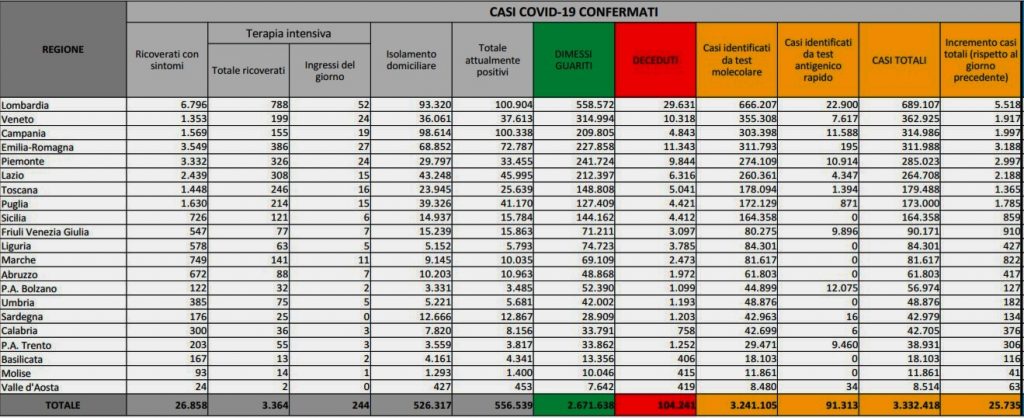 È ancora la Lombardia la regione con più casi giornalieri (+5.518), seguita da Emilia Romagna (+3.188), Piemonte (+2.997), Lazio (+2.188) e Campania (+1.997). I contagi totali da inizio epidemia sono 3.332.418. I guariti nelle 24 ore sono 16.292 (ieri 15.976), per un totale di 2.671.638. Ancora in netto aumento il numero degli attualmente positivi, 9.039 in più (ieri +8.502): i malati attuali sono ora 556.539. Di questi, 526.317 sono in isolamento domiciliare.