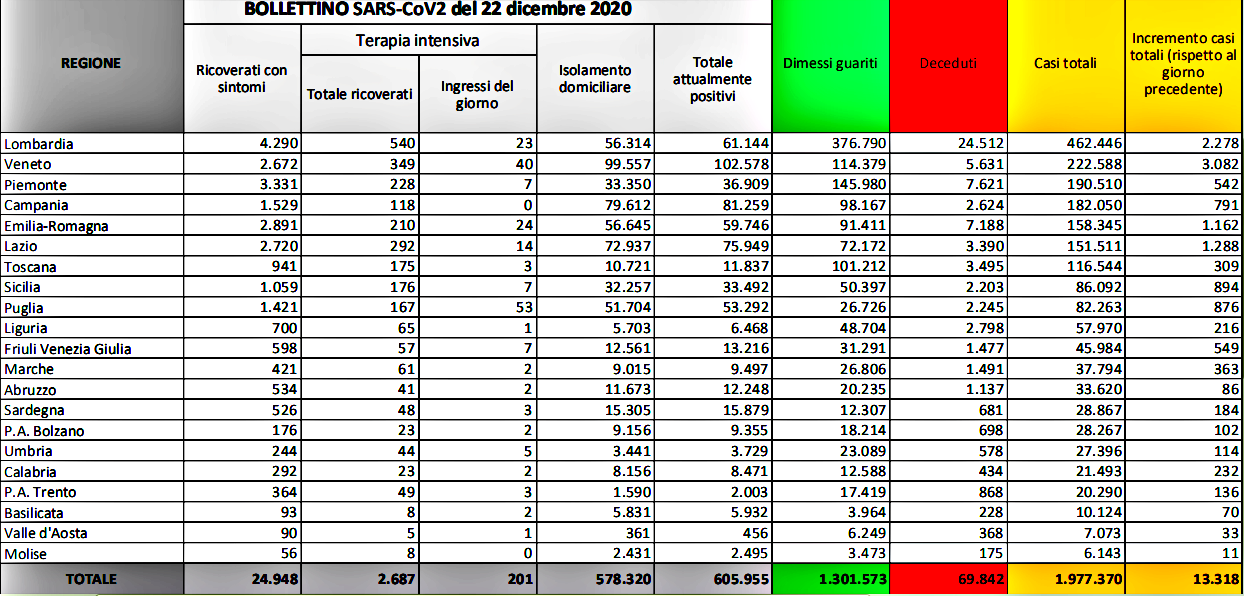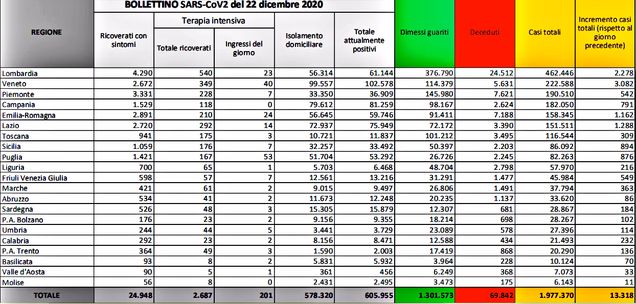 Sono 13.318 (ieri 10.872) i nuovi casi Covid-19 registrati in Italia dove, nelle ultime 24 ore, ci sono stati anche 628 (ieri 415) decessi. Sale così a 69.842 il numero dei morti da inizio pandemia nel nostro Paese. Continua a calare invece il numero degli attuali positivi. Oggi sono 605.955, 7627 meno di ieri. E’ quanto riporta l’odierno bollettino del ministero della Salute-Iss. Sale di 20315 unità il numero delle persone guarite o dimesse. Nelle ultime 24 ore sono stati effettuati 166.205 tamponi, 78. 316 più di ieri. Sono 24.948 le persone ricoverate con sintomi negli ospedali italiani, 197 meno di ieri. Sono oggi 2.687 le persone ricoverate in terapia intensiva, 44 in meno di ieri. Sono attualmente in isolamento domiciliare 578.320 persone, 7386 meno di ieri. Complessivamente sono positive 605.955 persone. Le regioni più colpite sono il Veneto (3.082), la Lombardia (2.278), il Lazio (1.288), l’Emilia Romagna (1.162) e la Sicilia (894).