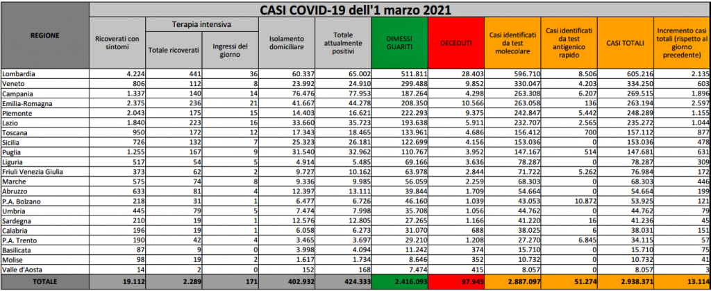 Sono 13.114 (17.445 ieri) i nuovi casi di Covid-19, registrati nelle ultime 24 ore in Italia e 246 (192 ieri) i morti (97.945 vittime da inizio pandemia), a fronte di 10.894 guariti. È quanto emerge dall’odierno bollettino del ministero della Salute-Iss. Aumentano i ricoveri in terapia intensiva: +58 su scala nazionale, così come quelli in reparti non intensivi, +474.