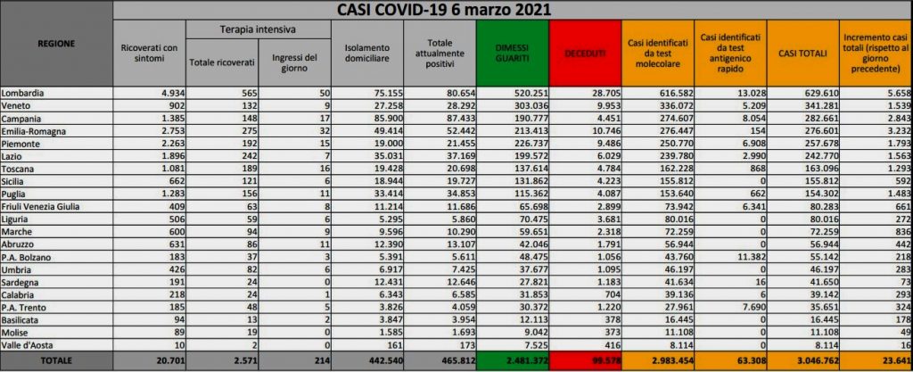 Sono 23.641 i contagiati al Covid-19 registrati oggi in Italia (leggermente in calo su ieri, erano 24.036) portando il totale dall’inizio pandemia a 3.046.762). Ma aumentano, anche se di poco, le vittime: 307 le vittime contro le 297 di ieri, per un totale di 99.578.E’ quanto emerge dall’odierno bollettino del ministero della Salute-Iss.  Sono stati 355.024 i tamponi, oltre 20mila in meno di quelli contati ieri. Il tasso di positività sale al 6,6% (era al 6,3%). E prosegue anche l’aumento dei ricoveri: le terapie intensive sono 46 in più (ieri +50), con 214 ingressi del giorno, 2.571 in totale. Mentre nei reparti ordinari sono state ricoverate 327 persone in più (ieri +217), 20.701 in tutto. Gli attualmente positivi sono 465.812 (+9.342): 442.540 si trovano in isolamento domiciliare, 20.701 sono ricoverati con sintomi. Inoltre, 13.984 i dimessi/guariti (2.481.372 il totale).