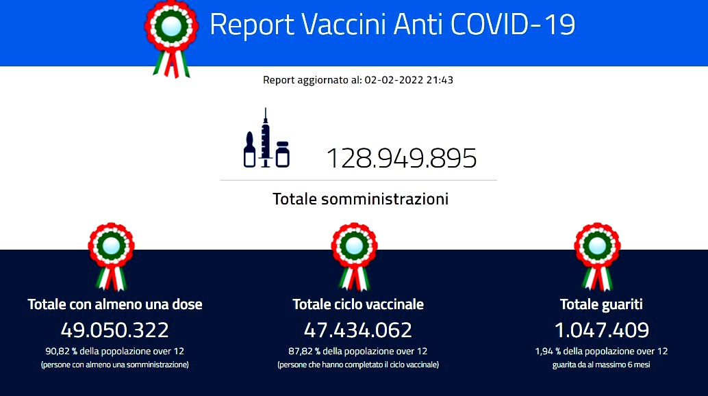 Secondo l’odierno bollettino del ministero della Salute, sono 118.994 i nuovi casi di positività al Covid-19 (ieri 133.142) e 395 i decessi (ieri 427) registrati in Italia nelle ultime 24 ore. Dall’inizio dell’epidemia sono 11.235.745 le persone che hanno contratto il virus Sars-CoV-2, mentre da febbraio 2020 le vittime totali sono 147.320. Sono in tutto 8.680.799 le persone guarite o dimesse e sono 187.816 quelle diventate negative nelle ultime 24 ore (ieri 248.971). Le persone attualmente positive sono in tutto 2.407.626, pari a -68.888 rispetto a ieri (-116.092 il giorno prima).
