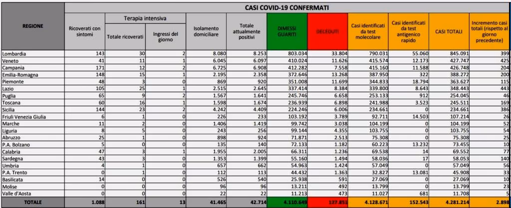 Salgono anche i ricoveri in terapia intensiva, sono 161 (ieri 153), con 13 nuovi ingressi (ieri +11); in calo invece di una unità i ricoverati nei reparti ordinari, sono in tutto 1.088. Le persone attualmente positive in Italia sono 42.714 (ieri 40.900); quelle in isolamento domiciliare 41.465 (ieri 39.658). La regione con più casi odierni è il Lazio con 443 (ieri 353), seguito dal Veneto con +425, quindi la Lombardia con +399, la Sicilia con +386, la Campania con 204 e l’Emilia Romagna con 200. Il totale di persone testate sale a 30.208.376. I casi in Italia dall’inizio dell’epidemia sono 4.281.214, i morti 127.851. I dimessi ed i guariti sono invece 4.110.649, con un incremento di 1.070 rispetto a ieri. Gli attualmente positivi sono 42.714, in aumento di 1.814 unità nelle ultime 24 ore. Le persone in isolamento domiciliare sono 41.465 (+1.807).