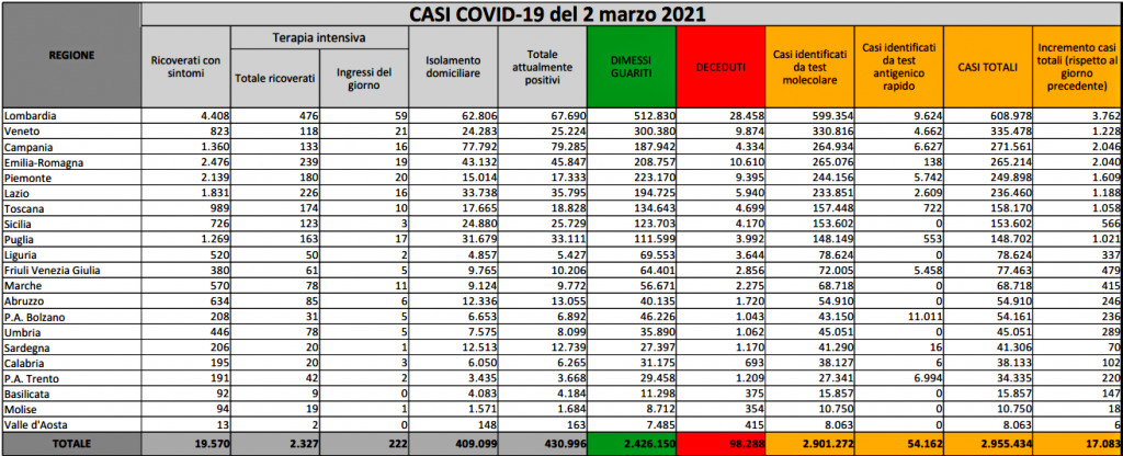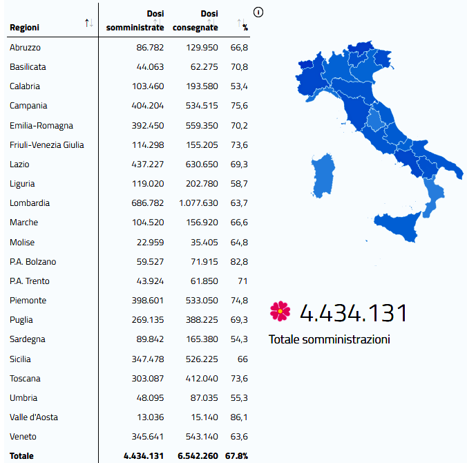 Nelle ultime 24 ore, sono stati analizzati 154.603 tamponi molecolari e 181.380 test rapidi antigenici. La percentuale di tamponi molecolari positivi è stata del 9,2 per cento, mentre quella dei test antigenici dell’1,6 per cento. A fronte di 335.983 tamponi il tasso di positività si attesta al 5,1%, in calo del 2,6% rispetto a ieri. Sono oggi le 4.434.131 dosi di vaccino somministrate in totale. Al momento sono contagiati ben 430.996 persone, con aumento di 6.663 unità rispetto a ieri: in isolamento domiciliare 405.099 persone con pochi o zero sintomi, 2.327 terapie intensive occupate (+38, 222 ingressi giornalieri) e 19.570 ricoverati con sintomi negli ospedali, aumento importante di 496 unità rispetto alla giornata di lunedì. Le regioni che hanno registrato più casi nelle ultime 24 ore sono Lombardia (3.762), Campania (2.046), Emilia-Romagna (2.040), Piemonte (1.609) e Veneto (1.228).
