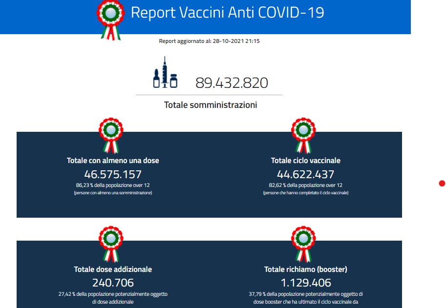 Si inverte in Italia la curva dei contagi da Covid (+43% nuovi casi) mentre risultano in aumento anche i ricoveri (+7,5%). Questo mentre in 7 giorni si è assistito ad un calo del -52,9% di nuovi vaccinati e al raggiungimento di 1,2 milioni di terze dosi. Lo rileva nel suo report settimanale, la Fondazione Gimbe che per quanto riguarda la settimana 20-26 ottobre, rispetto alla precedente, fotografa un aumento di nuovi casi passati da 17.870 a 25.585 dell’ultima settimana così come una diminuzione dei decessi (da 271 a 249). In lieve aumento i casi attualmente positivi (75.046 contro 74.546), le persone in isolamento domiciliare (72.101 contro 71.768) e i ricoveri con sintomi (2.604 contro 2.423), mentre calano le terapie intensive (341 contro 355). In dettaglio, rispetto alla settimana precedente, si registrano le seguenti variazioni: Decessi: 249 (-8,1%); Terapia intensiva: -14 (-3,9%); Ricoverati con sintomi: +181 (+7,5%); Isolamento domiciliare: +333 (+0,5%); Nuovi casi: 25.585 (+43,2%); Casi attualmente positivi: +500 (+0,7%).