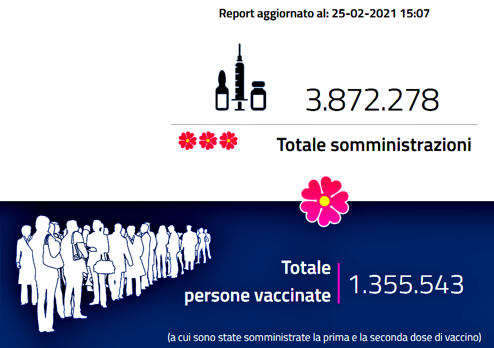 I guariti diventano 2.375.318 (+12.853). I casi attualmente positivi sono 396.143 (+6.725). La Regione che fa registrare il più alto numero di infezioni su base giornaliera è la Lombardia, seguita dalla Campania. Le dosi di vaccino anti-Covid somministrate finora sono state 3.824.331, mentre a ricevere entrambe le dosi ed essere quindi completamente vaccinati sono state 1.350.124 persone.