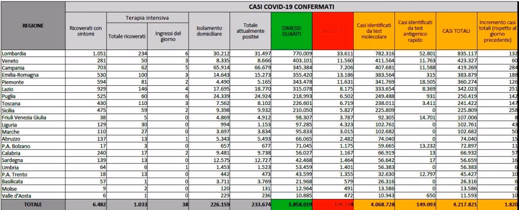 In totale i casi dall’inizio dell’epidemia sono 4.217.821, i morti 126.128. I dimessi e i guariti sono invece 3.858.019, con un incremento di 6.358 rispetto a ieri, mentre gli attualmente positivi scendono a 233.674, in calo di 4.622 nelle ultime 24 ore. In isolamento domiciliare ci sono 226.159 persone (-4.485 rispetto a ieri). A livello territoriale, le Regioni con il maggior numero di contagi sono la Campania (284), la Sicilia (258), il Lazio (251) e l’Emilia-Romagna (188).