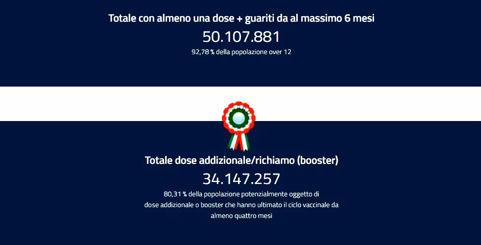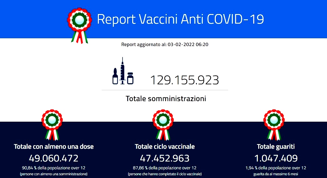 In cifre, secondo l’odierno bollettino sull’emergenza coronavirus del ministero della Salute, sono 112.691 i nuovi casi di positività al Covid-19 (ieri 118.994) e 414 i decessi (ieri 395) registrati in Italia nelle ultime 24 ore. Dall’inizio dell’epidemia sono 11.348.701 le persone che hanno contratto il virus Sars-CoV-2, mentre da febbraio 2020 le vittime totali sono 147.734. Sono in tutto 8.872.737 le persone guarite o dimesse e sono 191.938 quelle diventate negative nelle ultime 24 ore (ieri 187.816). Le persone attualmente positive sono in tutto 2.328.230, pari a -79.396 rispetto a ieri (-68.888 il giorno prima).