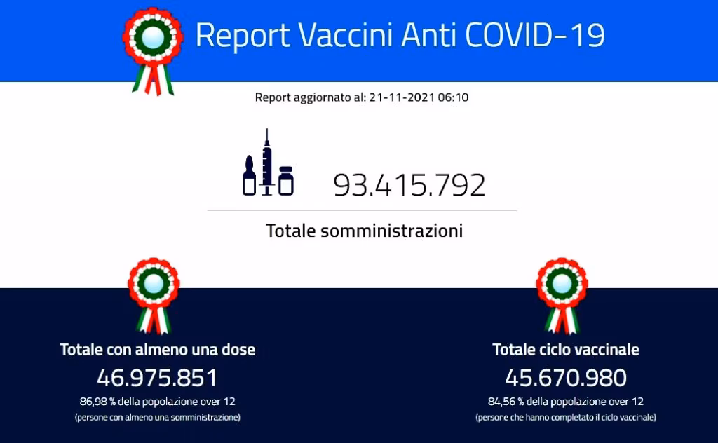 Intanto, Walter Ricciardi, consigliere del ministro della Salute interviene in merito alla decisione dell’Agenzia europea del farmaco (Ema) sull’autorizzazione al vaccino contro il Covid di Pfizer-BioNTech per i bambini dai 5 agli 11 anni prevista per il 29 novembre. “È una falsa diceria che i bambini non si ammalano – afferma Ricciardi -. Oggi sono quasi il 30% dei casi di infezione. In Gran Bretagna sono decine di migliaia i bambini ammalati, centinaia quelli ospedalizzati e decine i morti. Spero che i genitori capiranno che il vaccino è il più importante gesto di protezione nei confronti dei figli stessi”.