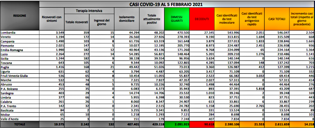 La regione con più casi nelle 24 ore è la Lombardia (+2.504), seguita da Campania (+1.665), Emilia Romagna (+1.364), Puglia (+1.215) e Lazio (+1.141). I casi totali sono 2.611.659. I guariti sono 14.995 (ieri 17.680), per un totale di 2.091.923. Sempre in discesa il numero delle persone attualmente positive, 1.159 in meno (ieri -4.445): i malati ancora attivi sono ora 429.118. Di questi, 407.401 sono in isolamento domiciliare, 982 meno di ieri.