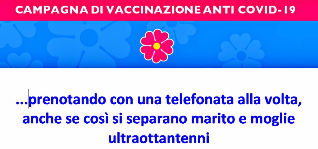 B. F. di 88 anni e la moglie A. devono prenotare il vaccino e lui, da bravo siciliano all’antica, prende in mano la situazione. Dai giornali sa che si può chiamare un numero verde (il computer non sa nemmeno accenderlo) e, da uomo d’esperienza, si organizza: telefono in viva voce, codici fiscali, documenti di identità; televisione, telecomando, “guantierina” con tazzina, cucchiaino, zucchero e moka fumante preparata da A. nella sua funzione di angelo dei fornelli, e via.