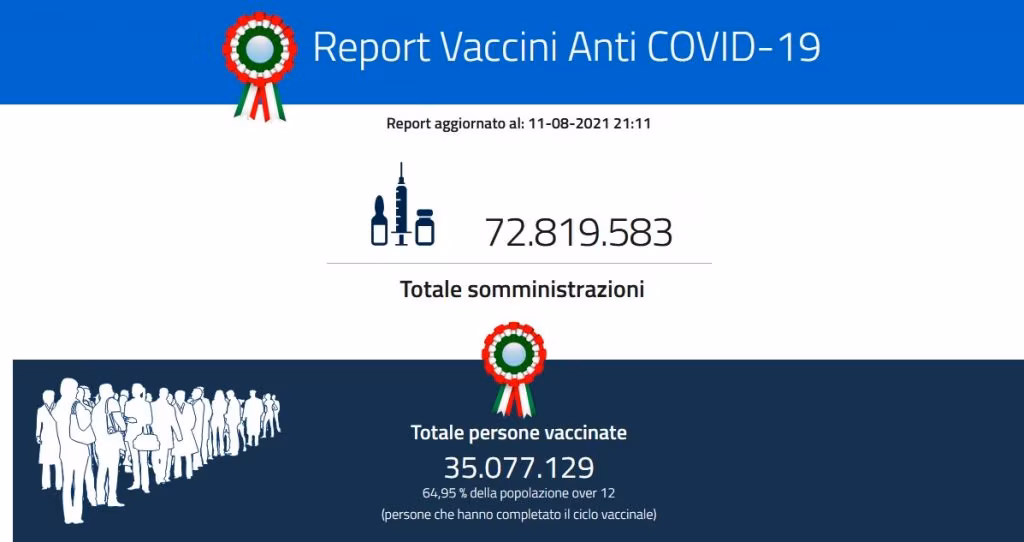 È di 6.968 nuovi casi di Covid-19 e 31 morti il bilancio delle ultime 24 ore secondo il bollettino quotidiano del ministero della Salute. I dati di oggi arrivano a fronte di 230.039 test analizzati contro i 241.766 di ieri. Il tasso di positività cresce dal 2,3% di ieri al 3,0% (+0,7%) di oggi. Ieri, 10 agosto, erano stati 5.636 i nuovi contagi e 31 le vittime come oggi. Va tuttavia precisato che i decessi delle ultime 24 ore sono esattamente 27 mentre le altre 4 vittime risalgono tra l’8 e il 10 agosto, come comunicato dalla Regione Sicilia. Il totale delle vittime dall’inizio pandemia sale così a 128.304.