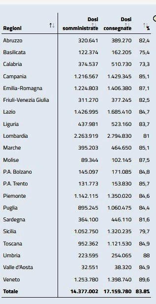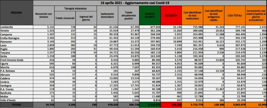 mento i tamponi (327.704 oggi contro i 319.633 di ieri) per un tasso di positività che scende al 4,86% In totale i casi da inizio epidemia sono 3.842.079, i morti 116.366. Gli attualmente positivi sono 506.738 (-3.285 rispetto a ieri), mentre i guariti e dimessi dall’inizio della pandemia sono 3.218.975 (+18.779). In isolamento domiciliare ci sono 478.629 persone (-2.390 rispetto a ieri). Sono 3.366 i pazienti ricoverati nelle rianimazioni per Covid in Italia, in calo di 51 unità rispetto a ieri nel saldo giornaliero tra entrate e uscite, mentre gli ingressi giornalieri, secondo i dati del ministero della Salute, sono stati 199 (ieri 211). Nei reparti ordinari sono invece ricoverate 24.743 persone, in calo di 844 rispetto a ieri.