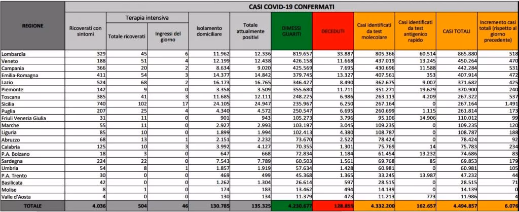 In cifre, in Italia si contano 6.076 (ieri 4.168) nuovi contagi da Covid-19 nelle ultime 24 ore. Si registrano, inoltre, altri 60 decessi (ieri 44). Il totale dei morti dall’inizio della pandemia sale così a 128.855. Nelle ultime 24 ore sono stati eseguiti 266.246 tamponi, con un tasso positività che si attesta al 2,3%% (-1,8% rispetto a ieri). Ancora in aumento le persone ricoverate in ospedale con sintomi (+ 108) e in terapia intensiva (+19). Sono 6.248, invece, i nuovi guariti. A oggi sono 75.622.961 le dosi di vaccino somministrate in totale. La regione con più contagi è ancora una volta la Sicilia, che oggi registra 1.491 nuovi casi.