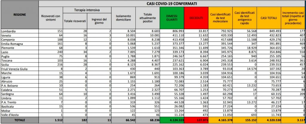 Sono 182 i pazienti ricoverati in terapia intensiva per Covid in Italia, 4 in più rispetto a ieri nel saldo tra entrate e uscite. Gli ingressi giornalieri sono 11 (ieri 16). I ricoverati con sintomi nei reparti ordinari sono 1.512, in aumento di 120 rispetto a ieri. I casi in Italia dall’inizio dell’epidemia sono 4.320.530, i morti 127.971. I dimessi e i guariti sono invece 4.124.323, con un incremento di 1.114 rispetto a ieri. Gli attualmente positivi sono 68.236, in aumento di 1.979 unità nelle ultime 24 ore.