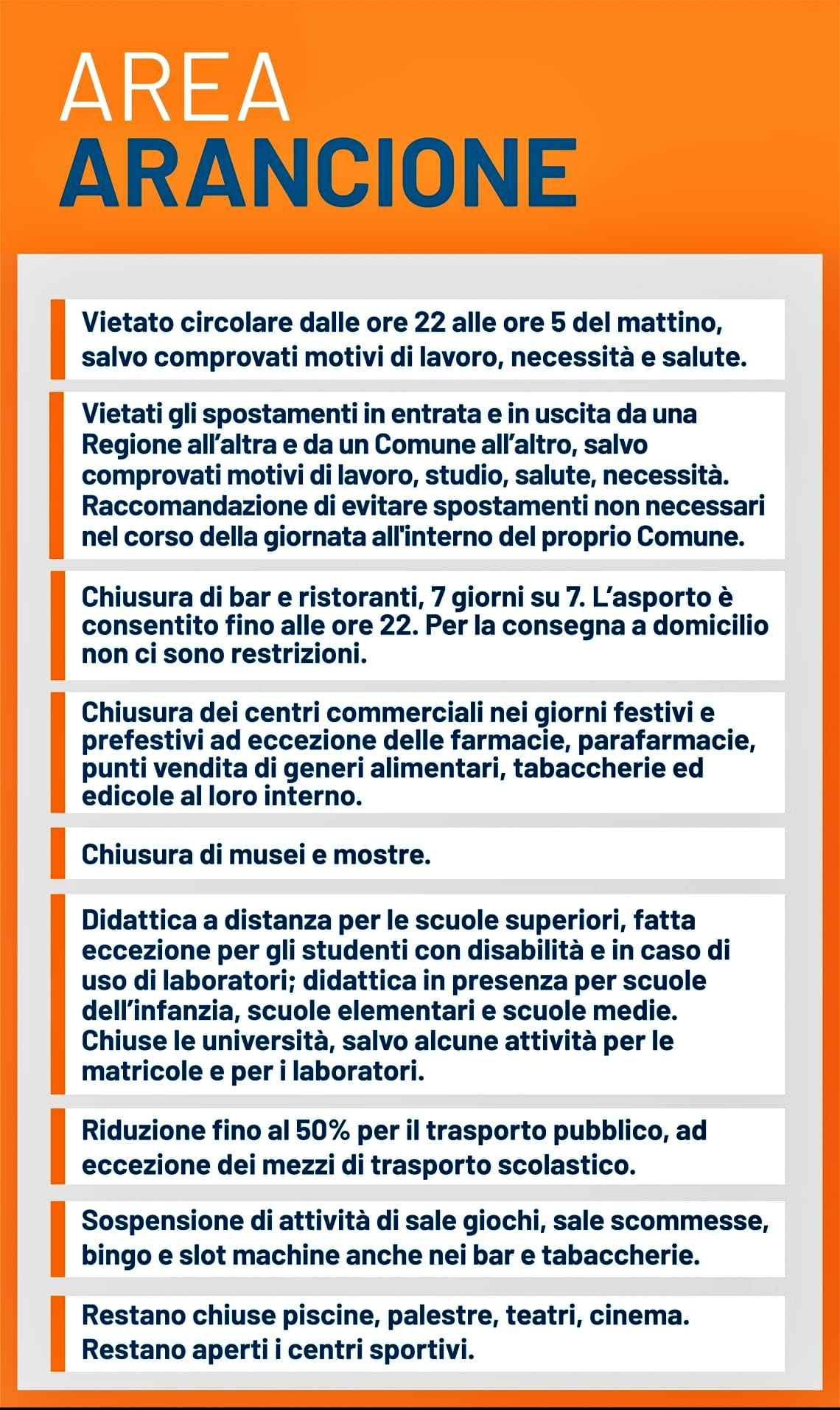 Complessivamente, quindi, la ripartizione delle Regioni nelle diverse aree di rischio conta in area gialla ancora la Campania, Emilia Romagna, Friuli Venezia Giulia, Lazio, Marche, Molise, Provincia autonoma di Trento, Sardegna, Veneto; in area arancione Abruzzo, Basilicata, Liguria, Puglia, Sicilia, Toscana, Umbria; in area rossa Calabria, Lombardia, Piemonte, Valle d’Aosta, Provincia Autonoma di Bolzano.