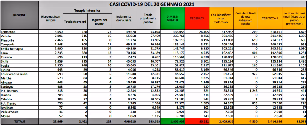 Il bollettino di ieri 19 gennaio registrava 10.497 nuovi casi di pazienti infetti da Sars-Cov-2 su un totale di 254.070 tamponi (di cui 135.388 molecolari e oltre 118mila antigenici). Ricoverati con sintomi (-185) e il numero dei pazienti in terapia intensiva (-57 il saldo tra ingressi e uscite). In controtendenza purtroppo il numero dei decessi: 603 mentre erano stati registrati una minore occupazione dei posti letto negli ospedali (-57 in terapia intensiva e -185 in area non critica). Con 1.876 è oggi la Lombardia la regione con il maggior aumento di nuovi casi Covid-19. Segue la Sicilia con 1.486, poi il Veneto con 1.359, il Lazio con 1.281, la Puglia 1.159, l’Emilia Romagna con 1.090. In tutte le altre regioni si registrano meno di mille casi. La regione con l’incremento minore è oggi la Valle d’Aosta con 14.