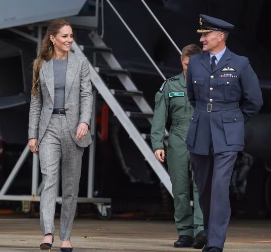 L’outfit scelto per l’occasione ha rafforzato il messaggio di equilibrio tra tradizione e modernità. Il tailleur grigio a quadri di Bella Freud — brand britannico noto per il suo approccio minimalista e intellettuale — si è rivelato una scelta simbolica: sobrio, ma distintivo. Abbinato al top nero di Alexander McQueen, maison di cui Kate è ambasciatrice di lunga data, il look ha unito eleganza formale e funzionalità, adattandosi perfettamente all’ambiente operativo della base aerea. I tacchi alti, spesso criticati in contesti simili, non sono stati un ostacolo, ma un segno di determinazione: Kate ha rifiutato di sacrificare il proprio stile, pur dimostrando piena padronanza del contesto.