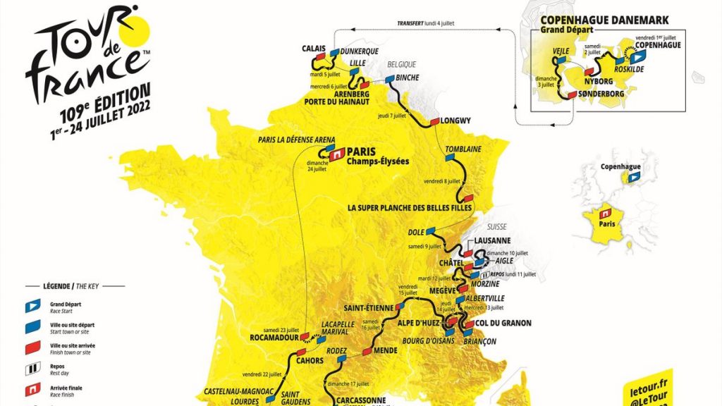 Partirà con una cronometro lunga 13 chilometri sulle strade di Copenaghen, venerdì primo luglio 2022, la 109esima edizione del Tour de France di ciclismo. La Grand Boucle si concluderà a Parigi domenica 24 luglio sui Campi Elisi alla ventunesima tappa. La presentazione delle squadre si svolgerà nei Giardini di Tivoli mercoledì 29 giugno. Dopo le prime tre frazioni danesi, la carovana ripartirà dalla Francia, a Dunkerque. Tra le grandi insidie, già il quinto giorno arriverà il temuto pavé, mentre il settimo giorno il primo arrivo in salita alla Planche des Belles Filles. L`unica altra crono sarà invece il penultimo giorno, con 40 chilometri che porteranno il totale di 53 chilometri contro il tempo. Gran finale, al termine di 3328 chilometri che prevedono sei tappe di montagna e cinque arrivi in salita, ovviamente a Parigi, con conclusione sugli Champs-Elysées. A Longwy la tappa più lunga (220 chilometri).
