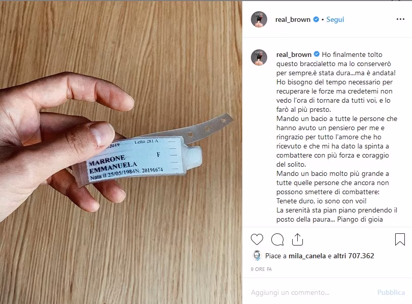 Il giornalista e conduttore radiofonico Luca Bianchini scrive: “Tesoro sono felice. In quei momenti torniamo tutti nella culla da cui siamo partiti, fragili e piangenti. Presto Emmanuela lascera’ di nuovo il posto a Real Brown”. Nicoletta Romanoff risponde: “Anche noi te ne vogliamo Emma”, mentre la “Iena” Giovanna Nina Palmieri le scrive: “Tutti con te”. Cosi’ come Francesca Michelin che scrive: “Sei una guerriera. Siamo con te”.