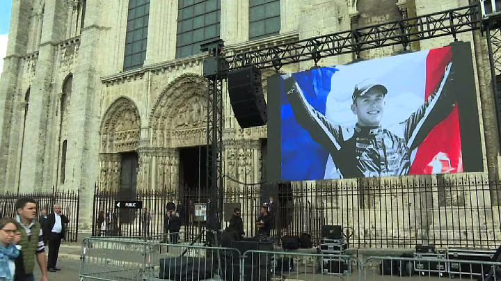Una grande bandiera francese con il volto di Antoine Hubert, davanti alla cattedrale del Chartres, per l’ultimo saluto al pilota di Formula 2 morto nell’incidente sul circuito di Spa in Belgio sabato 31 agosto. Anthoine Hubert, 22 anni, si è scontrato con le monoposto del francese Giuliano Alesi e dello statunitense Juan Manuel Correa al secondo dei 25 giri previsti. Nelle ore delle esequie per Hubert si sono aggravate le condizioni del pilota americano coinvolto nell’incidente. Correa è attualmente ricoverato in un centro medico specializzato di Londra e si trova in una situazione di coma indotto.
