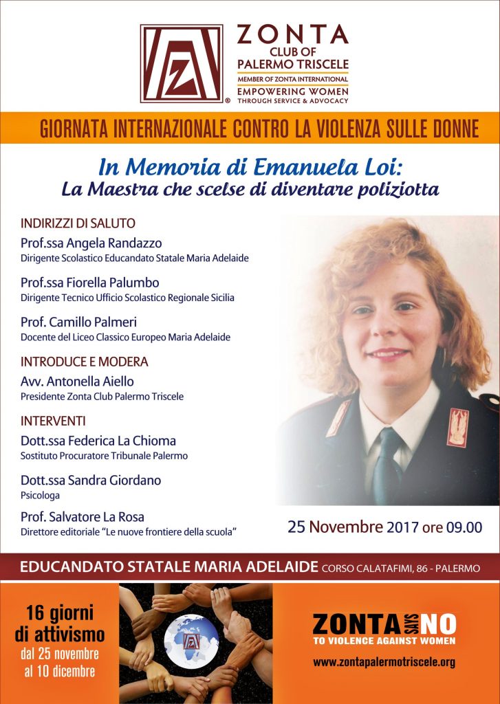 In ricordo di Emanuela Loi, lo Zonta Club Palermo Triscele ha organizzato la manifestazione “In memoria di Emanuela Loi: la maestra che scelse di diventare poliziotta”. La Loi è la prima Agente donna della Polizia di Stato a restare uccisa in servizio dilaniata dall’esplosione all’età di 24 anni insieme al Giudice Borsellino e ai quattro colleghi in quel pomeriggio di domenica 19 luglio 1992, a Palermo in via D’Amelio. L’evento, in programma sabato 25 novembre 2017, ore 9, si svolgerà presso l’Educandato Statale “Maria Adelaide” di Corso Calatafimi, 86 Palermo. Emanuela, era una donna ancora prima di essere Agente, che era riuscita ad inserirsi in un mondo da caserma, fino a poco tempo prima chiuso ed inaccessibile, ed è morta mentre stava lavorando, combattendo contro l’ingiustizia e l’illegalità. A distanza di 25 anni, Emanuela è ancora un simbolo fondamentale per tutte le donne e rappresenta la fedeltà nelle Istituzioni sino all’estremo sacrificio che deve essere sempre presente nella memoria di tutti, in particolare nelle giovani generazioni.