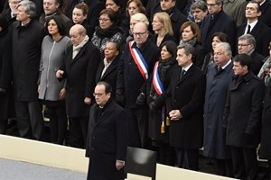 Il presidente francese, Francois Hollande, insieme ad altri membri del governo e dell’opposizione, tra i quali anche Nicolas Sarkozy, rende omaggio alle vittime del terrorismo in una cerimonia a Les Invalides, a Parigi.