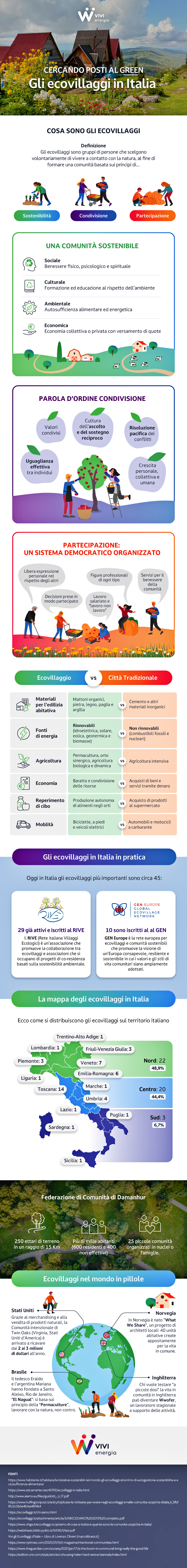 Si tratta di vere e proprie comunità ecologiche diffuse in tutto il mondo. Come riporta l’infografica “Cercando posti al green: gli ecovillaggi in Italia” realizzata da VIVI Energia, in Italia ce ne sono 45, di cui 29 già attive e iscritte al RIVE (Rete Italiana Villaggi Ecologici), il principale ente italiano che promuove i rapporti sinergici tra gli ecovillaggi e le associazioni di sostenibilità ambientale.