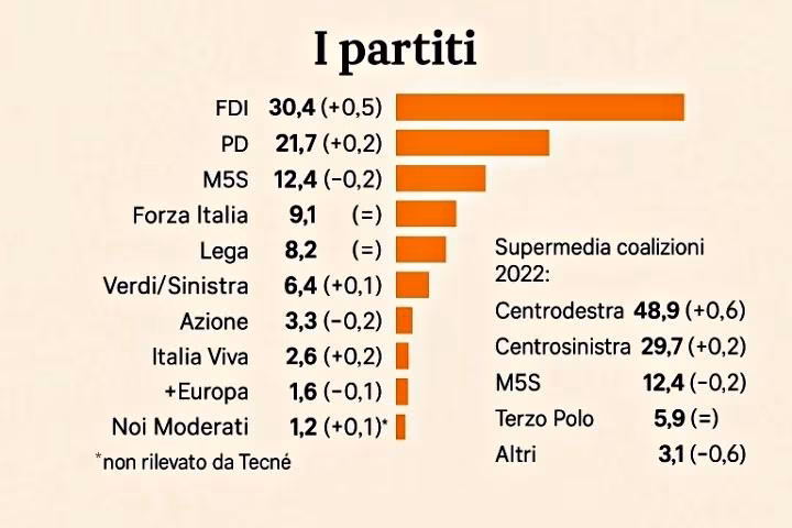 L’analisi della Supermedia evidenzia una sostanziale stabilità del quadro politico nazionale, interrotta unicamente da una variazione statisticamente significativa che riguarda il partito del presidente del Consiglio. Fratelli d’Italia registra una crescita dello 0,5 per cento, riportandosi al di sopra della soglia psicologica del 30 per cento. Gli altri principali partiti mantengono gli ordini di grandezza consolidati negli ultimi due mesi: il Partito Democratico (PD) si attesta al 21,7 per cento, mentre il Movimento 5 Stelle (M5S) flette leggermente al 12,4 per cento. Nella competizione interna alla maggioranza, Forza Italia si conferma al 9,1 per cento, mantenendo un vantaggio di circa un punto sulla Lega, ferma all’8,2 per cento. Tra le forze minori, Alleanza Verdi e Sinistra (AVS) supera il 6 per cento, seguita da Azione al 3,3 e Italia Viva al 2,6 per cento.