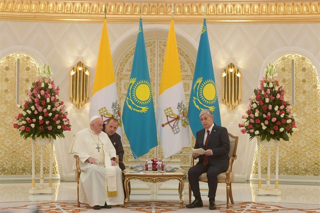È arrivato poco dopo le 17.15 ora locale, (11.15 GMT) ed è stato condotto al palazzo presidenziale per i colloqui con il presidente Kassym-Jomart Tokayev. “Sono onorato di essere qui con voi, in questa terra tanto estesa quanto antica, nella quale vengo come pellegrino di pace, in cerca di dialogo e di unità. Il nostro mondo ne ha urgente bisogno, ha bisogno di ritrovare armonia” ha detto il Pontefice.