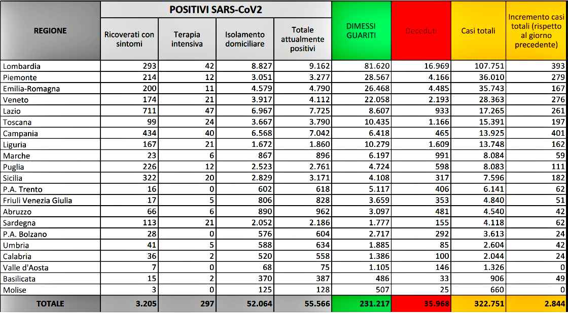Sono 2.844 i nuovi casi positivi al coronavirus registrati oggi in Italia, 27 invece le persone decedute