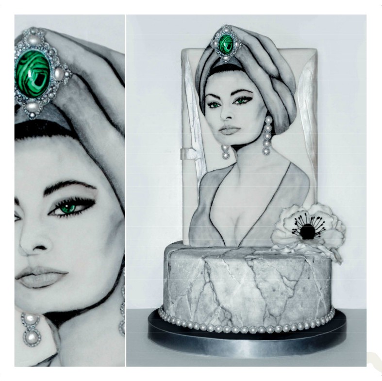 Entrambe le creazioni, perché di questo si tratta, sono assolutamente uniche nel loro genere poiché incarnano l’unicità creativa di una pittrice che ha portato un vento nuovo nell’arte intesa nel senso classico del termine; ha celebrato Miss Italia con una cake, realizzata insieme al pasticcere Gian Paolo Panizzolo, in cui ha dipinto sui quattro lati le miss simbolo di ogni ventennio, mentre per la torta dedicata all’evento benefico del Polo ha prodotto una vera e propria scultura in cui sulla base ha disegnato un giocatore intento a colpire la pallina mentre sulla parte superiore ha scolpito la testa di un cavallo, animale simbolo e protagonista dell’aristocratico gioco. Particolarmente belle, secondo il mio punto di vista, sono le torte iconiche, quelle in cui ha ritratto le grandi dive del cinema degli anni Cinquanta: da Audrey Hepburn raffigurata negli abiti del personaggio che l’ha resa celebre cioè Holly Golightly di Colazione da Tiffany, a Marylin Monroe in una delle immagini più note, passando per la nostra Sofia Loren, splendida in uno dei suoi caratteristici turbanti.