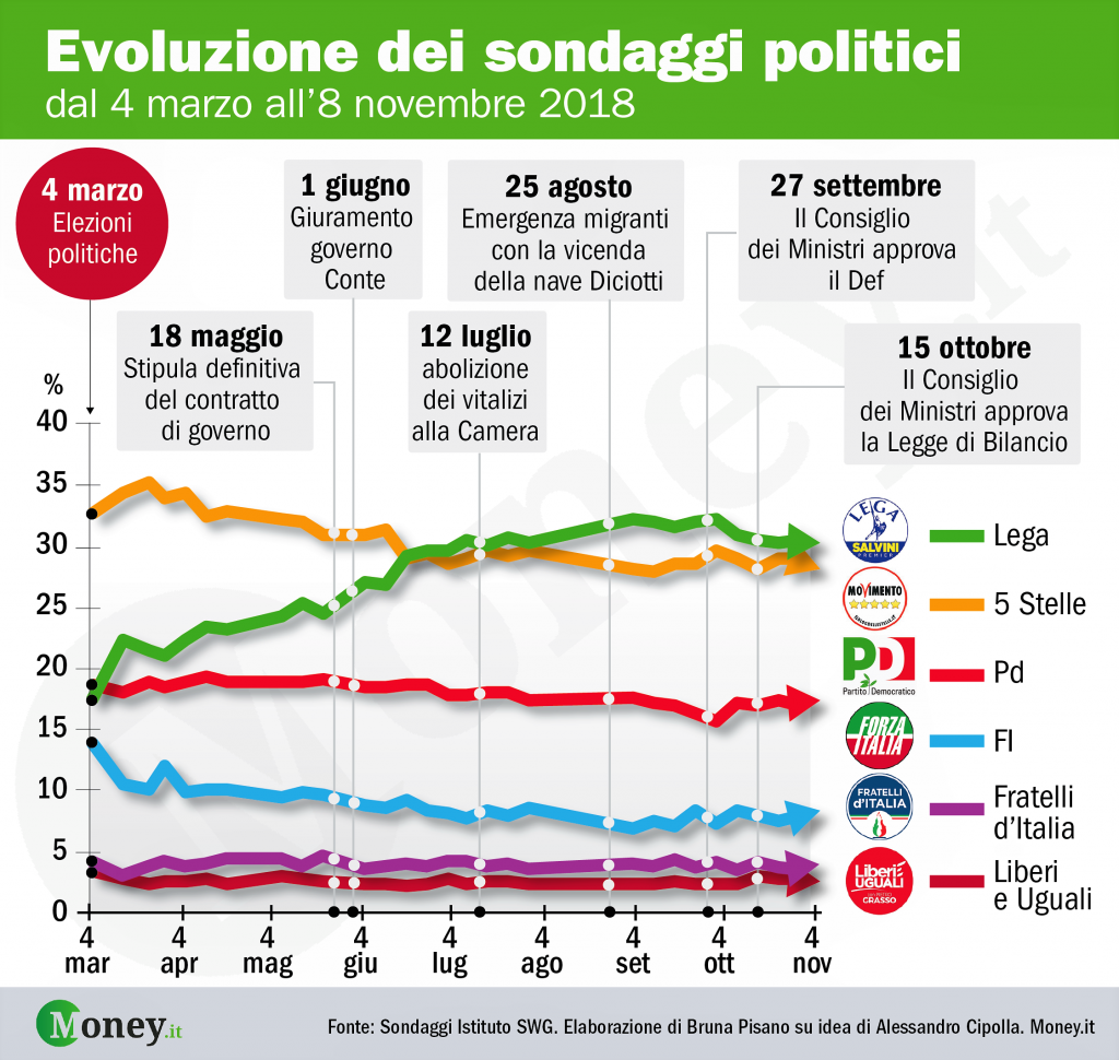 Oltre al boom post-elezioni, la Lega ha fatto registrare la sua crescita più sostanziale dopo altri due appuntamenti elettorali (22 aprile, 10 giugno) che hanno visto trionfare il centrodestra (regionali e amministrative), e nel clue della crisi dei migranti (25 agosto, caso nave Diciotti). Il Movimento 5 Stelle ha ottenuto il 32,68% alle elezioni del 4 marzo e registrato un exploit soprattutto al Sud, dove in alcuni seggi ha anche ottenuto la maggioranza assoluta. Sorpassati nei sondaggi dalla Lega, i 5 Stelle comunque hanno registrato dei buoni picchi di crescita in concomitanza con l’abolizione dei vitalizi alla Camera (12 luglio) e l’approvazione del Def (27 settembre), che dà il via libera al reddito di cittadinanza. Guardando l’andamento dei sondaggi, i pentastellati hanno toccato l’apice il 23 marzo (35,2%), per poi iniziare a scendere soprattutto in seguito all’accordo di governo con la Lega, poco gradito con l’elettorato più a sinistra.