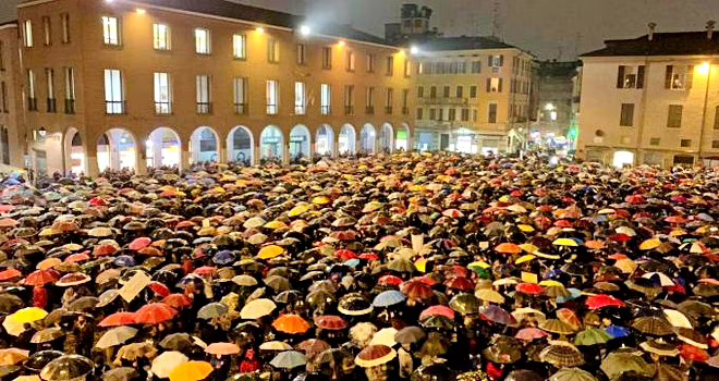 Le “sardine” hanno colpito ancora. Il movimento, slegato dai partiti, nato spontaneamente in occasione della visita di Salvini a Bologna, ha di nuovo riempito una piazza, quella di Modena, per contestare il leader della Lega e contro razzismi, sovranismi e odio. Armate di ombrelli sotto la pioggia battente, senza simboli di partito o bandiere, alcuni con in mano una sardina, diventata simbolo del movimento, invito a ritrovarsi in tanti stretti come sardine, migliaia di persone soprattutto giovani, hanno affollato Piazza Grande. Un gruppo di manifestanti ha intonato “Bella ciao”. Il leader leghista ha modificato il programma, cancellando il previsto aperitivo in centro.