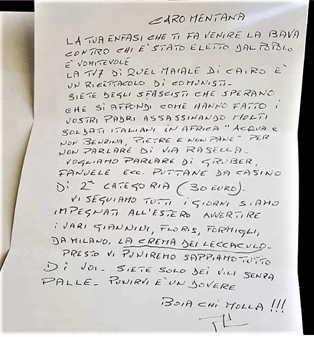 Una lettera contenente offese e minacce è stata recapitata al direttore del Tg de La7 Enrico Mentana. E’ stato lo stesso giornalista a postare la foto sul suo profilo Instagram. La lettera contiene minacce nei confronti dello stesso Mentana, dei giornalisti di La7 e dell’editore Urbano Cairo e si conclude con la scritta “Boia chi molla” e una svastica.
