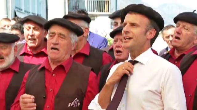 Macron con il basco canta con il coro locale negli Alti Pirenei