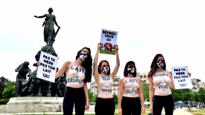 Mascherina e seno scoperto, la manifestazione a Parigi della Peta
