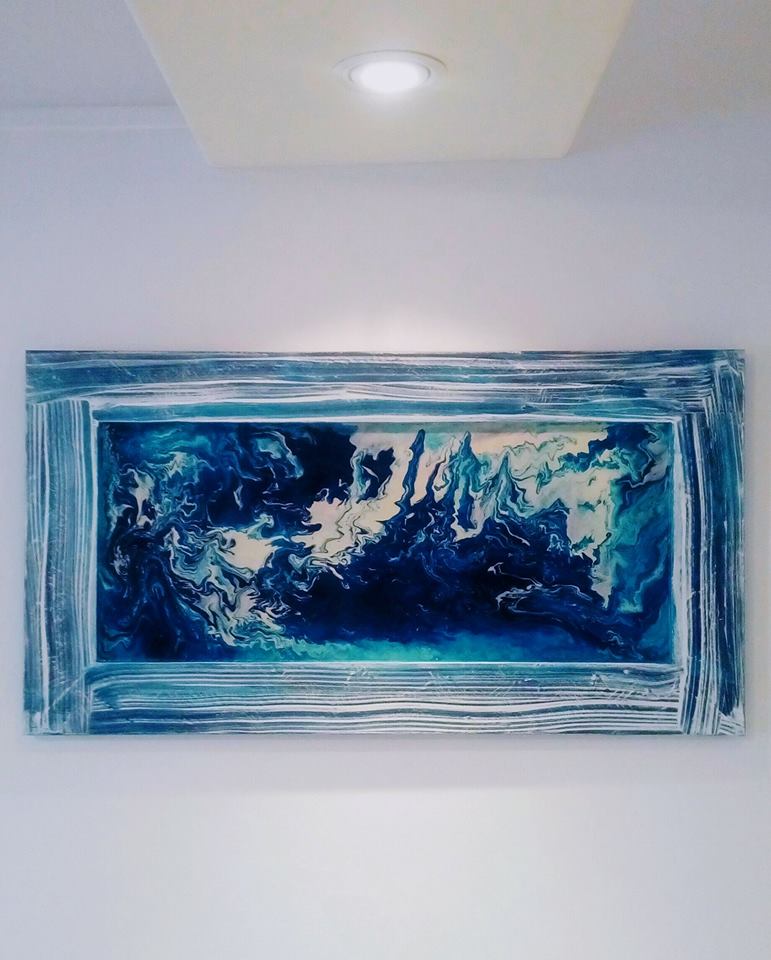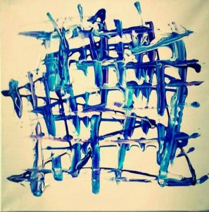 E poi in Implosione di arcobaleno, dove appare evidente il significato che per lei hanno i colori: il blu per toccare e liberare le corde più intime, più interiori, il prorompente rosso invece per raccontare le sensazioni più forti, passionali, energiche, simbolo di potenza e di un dinamismo vitale che è legato al percorso dell’esistenza di ogni essere umano, imprescindibile alternanza ai momenti più sereni, più fermi, più stabili. Ed è accettando questa alternanza che si apprende a trovare l’equilibrio Zen che ci permetterà di ballare sull’indefinito mondo delle emozioni, senza cadere oppure rialzandoci subito dopo averlo fatto. Ama dipingere il mare, a volte calmo e rasserenante, altre impetuoso e irrequieto, simbolo di un fluire, di un tutto scorre, che non può in alcun modo essere arrestato, interrotto, frenato.