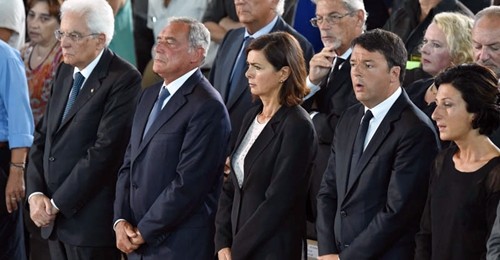 Oggi, lutto nazionale e funerali delle 49 vittime dell’ascolano, ad Ascoli Piceno, alla presenza del presidente della Repubblica, Sergio Mattarella, e del premier Matteo Renzi. “Ho chiesto anche io a Dio, che cosa si fa ora?”, ha detto il vescovo di Ascoli Piceno, monsignor Giovanni D’Ercole, nell’omelia ai funerali. “In questi giorni abbiamo sofferto insieme, adesso è il momento della speranza. Molti di voi in questi gironi mi hanno chiesto ‘e ora che si fa?’. Quante volte l’ho sentito dire in questi giorni. Una domanda che in questo momento sembra avere solo la risposta del silenzio. E anche io in queste notti di veglia ho fatto questa domanda a Dio: e ora Signore che si fa?”. “Il terremoto è polvere, quando sono arrivato a Pescara del Tronto, era ancora buio, ho visto solo polvere, il terremoto è polvere”, ha aggiunto il vescovo di Ascoli Piceno. “Il terremoto ha accomunato paesi fratelli, Pescara del Tronto, Arquata, Amatrice, Accumoli, che un tempo facevano parte di una sola diocesi; ed è importante che ora qui ci siano anche il vescovo di Terni e dell’Aquila, dove io ho conosciuto la sofferenza del dopo terremoto e mi appresto a viverla anche qui, come padre perché il vescovo è un papà e deve stare in mezzo alla gente”, ha concluso.