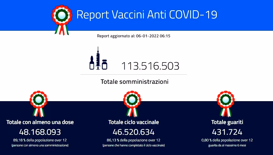 Secondo i dati Agenas del 5 gennaio a livello nazionale il tasso di occupazione di posti letto occupati da pazienti Covid nei reparti ospedalieri sale al 21% e, in 24 ore, cresce in 13 regioni: Calabria (al 33%) Liguria (32%), Abruzzo (17%), Lombardia (23%), Marche (24%), Molise (13%), Piemonte (25%), Puglia (13%), Sardegna (11%), Sicilia (25%), Toscana (17%), Umbria (28%), Veneto (21%). Stabili oltre soglia del 15%: Basilicata (20%), Campania (19%), Emilia Romagna (18%), Friuli (24%), Lazio (20%), PA Trento (19%). Il tasso è in calo nella PA Bolzano (16%) e Valle d’Aosta, che col 45% resta la regione con la situazione più critica.