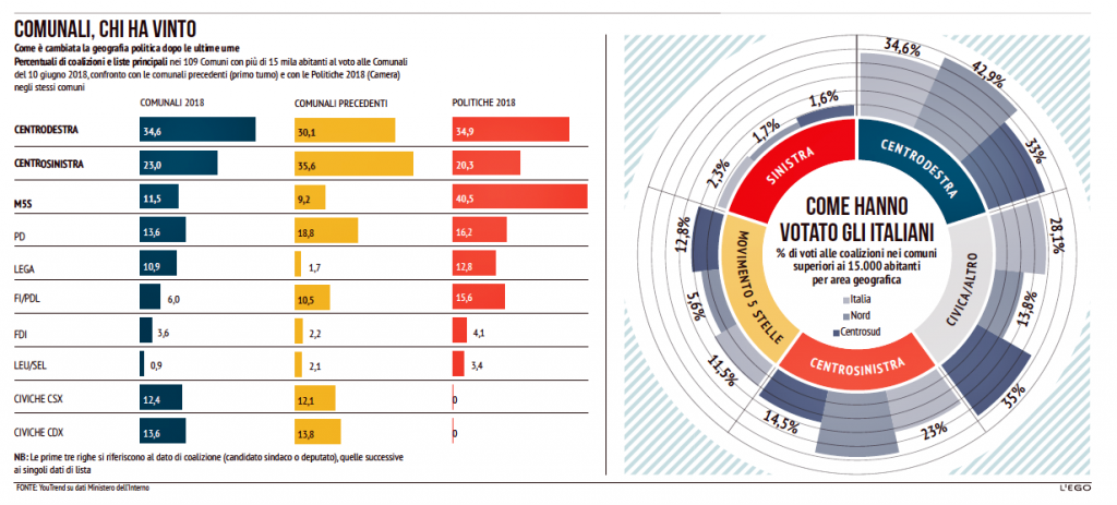 In Toscana, a Massa, Alessandro Volpi (cs) al 33,9% corre contro Francesco Per- siani (Cd) al 28,2%. A Pisa Michele Conti (cd) al 33,4% sfiderà Andrea Serfogli (cs) al 32,3%; a Siena il sindaco uscente Bruno Valentini (cs) al 27,4% al primo turno si è apparentato con l’ex sindaco della città Pierluigi Piccini (ex dirigente Mps e prima iscritto al Pd) alla testa di una lista civica che aveva preso il 21,4 e se la dovrà vedere con Luigi De Mossi (cd) (24,2). A Sondrio, Marco Scaramellini (cd) al 46,8% sfiderà Nicola Giugni (cs) al 36,1%; ad Avellino Nello Pizza (cs) al 42,9% incontrerà Vincenzo Ciampi (M5S) 20,2% col quale si sono schierate due liste civiche una riconducibile all’ex candidato Luca Cirpiano ex Pd e l’altra Dino Preziosi ex manager della società si trasporto pubblico della Regione; con il M5S anche Sabino Morano, candidato per il centrodestra che si è piazzato al terzo posto con appena il 10% dei voti. Ma il coordinatore provinciale di Forza Italia ha preso le distanze da questa decisione considerata «a titolo personale», e ha lasciato libertà di voto agli iscritti. A Brindisi Roberto Cavalera (cd) al 34,7% correrà contro Riccardo Rossi 23,5 (cs); a Teramo Giandonato Morra (cd) al 34,6%, che ha incassato, tra le polemiche, l’endorsement di Giovanni Cavallari (che ha preso con la sua civica il 10,24%) se la vedrà con Gianguido D’Alberto (cs) 21,1; a Terni derby tra forze di governo: Leonardo Latini della Lega al 49,2% appoggiato da Fi e Fdi contro Thomas De Luca (M5S) al 25%.[irp]