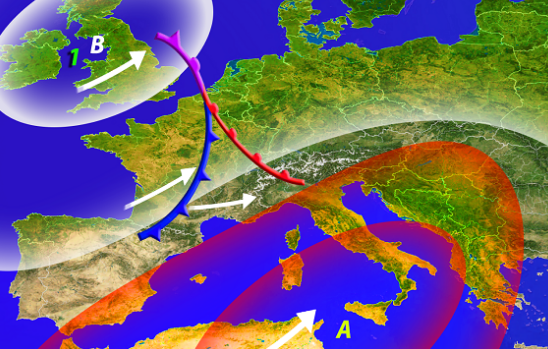 Espansione dell’alta pressione al Centro-Nord, con temperature via via più miti; instabile al Centro-Sud peninsulare e sulla Sardegna, con piogge e temporali sparsi.