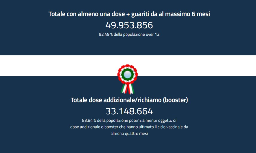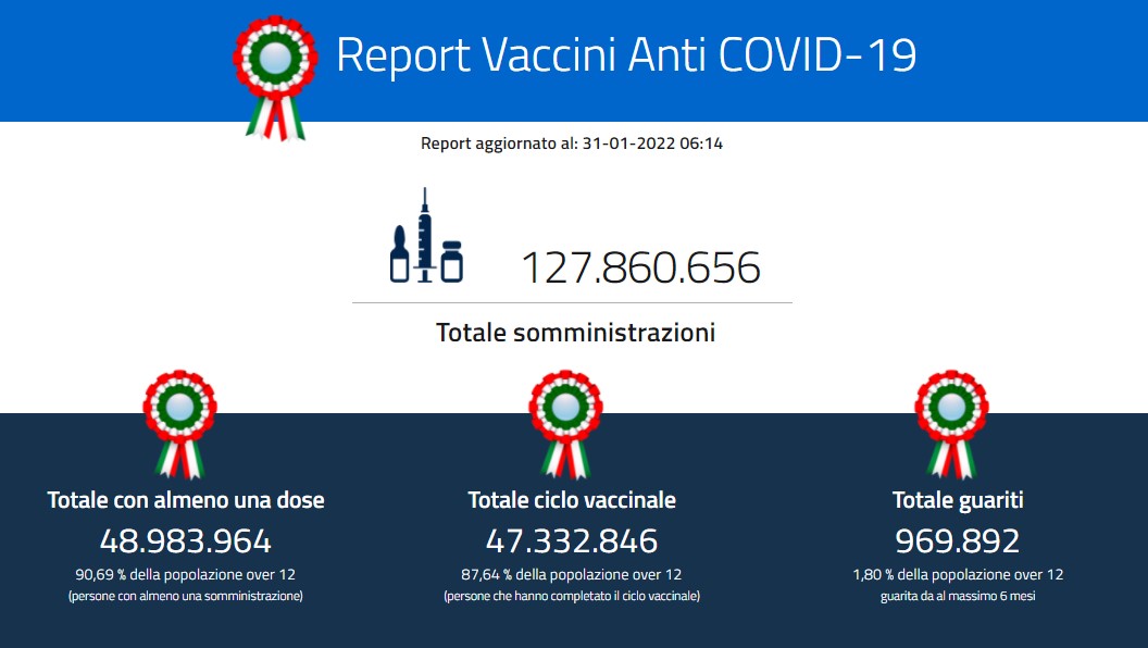 In cifre, secondo l’odierno bollettino del ministero della Salute, sono 57.715 i nuovi casi di positività al Covid-19 (ieri 104.065) e 349 i decessi (ieri 235) registrati in Italia nelle ultime 24 ore. Dall’inizio dell’epidemia sono 10.983.116 le persone che hanno contratto il virus Sars-CoV-2, mentre da febbraio 2020 le vittime totali sono 146.498. Gli attuali positivi sono 2.592.606, mentre i guariti sono 8.244.012. Compresi quelli molecolari e gli antigenici, i tamponi effettuati sono stati 478.314 (818.169 quelli riportati ieri). Il tasso di positività, ieri al 12,7%, oggi scende al 12,1%. Infine, sul fronte del sistema sanitario aumentano le persone ricoverate in area medica: 19.913 (+296 rispetto a ieri), mentre si registra un calo (-9) dei posti letto occupati in terapia intensiva: 1.584 malati, con 112 ingressi in 24 ore.