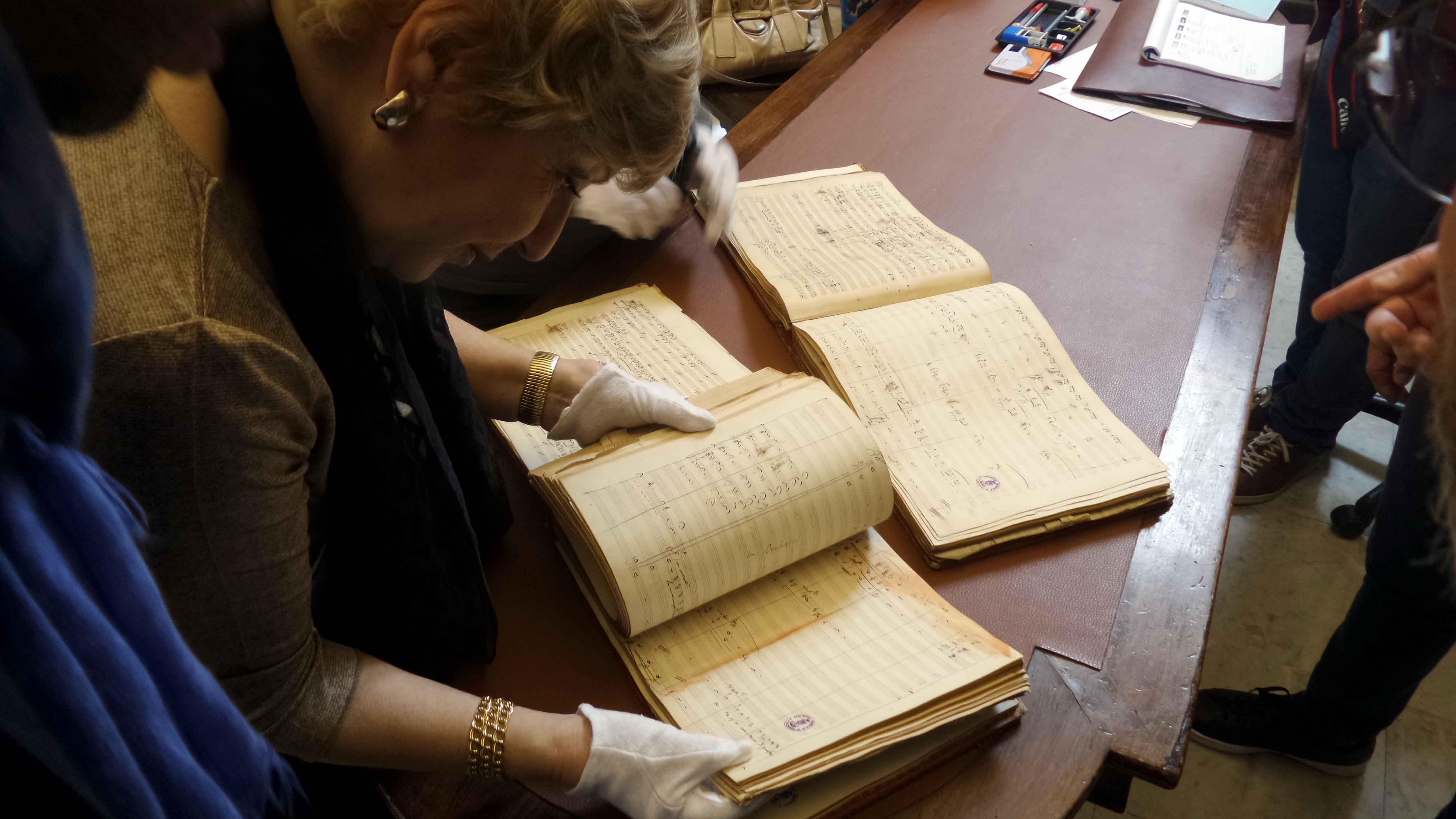 • La dirigente della Biblioteca Comunale Eliana Calandra mostra al cast la partitura autografa dei Puritani ©Franco Lannino